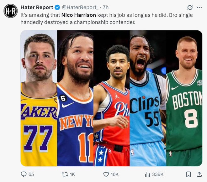 美媒HR写道:我真的不知道哈里森是如何留在独行侠GM任上这么久的,他活生生送走了一套夺冠阵容:布伦森、东契奇、格兰姆斯、小琼斯、波尔津吉斯。